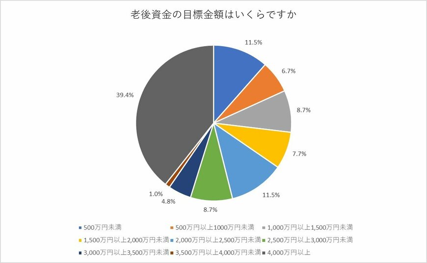 アンケート調査にて「老後資金の目標金額はいくらですか」と質問したところ、もっとも多くの回答が集まったのは「4000万円以上」の39.4%でした。