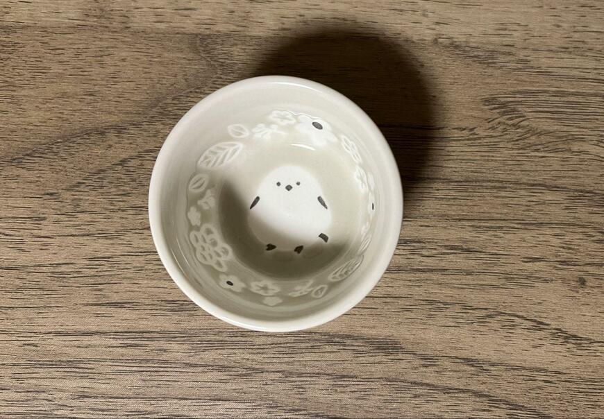 こちらは「ミニボウル のんびりシマエナガ」です。中央のシマエナガと、シマエナガを囲むようにデザインされた草花が素敵なアイテムです。