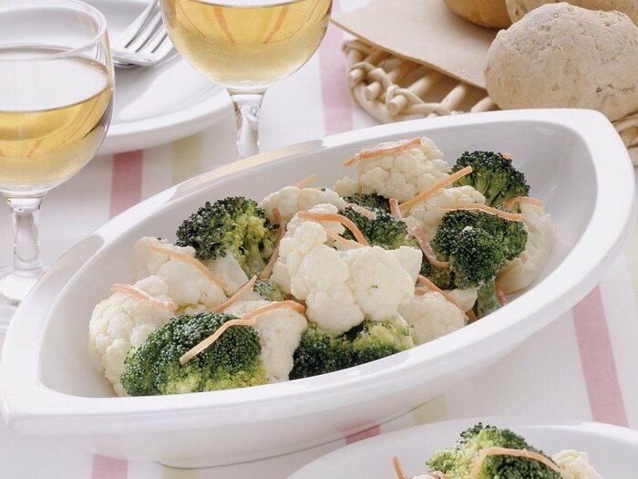 最初にご紹介するブロッコリーレシピは、カリフラワーと組み合わせたカラーのコントラストが鮮やかなサラダです。