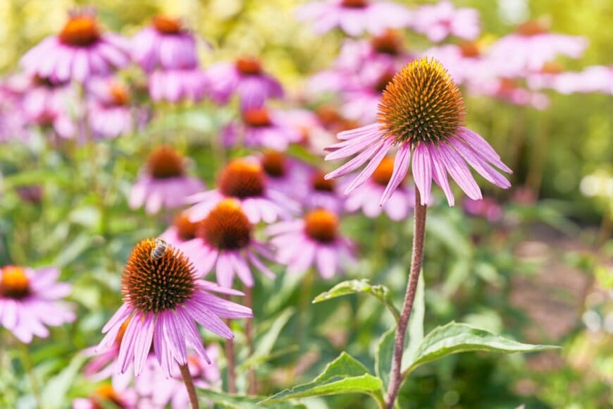 ハーブにも分類されるエキナセアはユニークな見た目の宿根草。花弁が傘のように開き、中心部分がイガグリのように盛り上がっているのが特徴です。