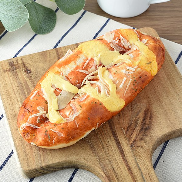 「完熟トマトのピザソースとオニオンスライス、チーズ入りソースをのせてふんわり焼き上げました。」