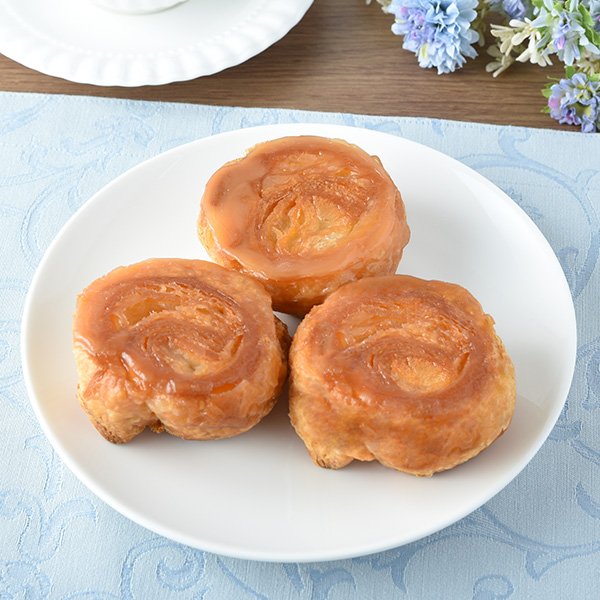 「デニッシュ生地にフランス産発酵バター入りフィリングを敷いて、飴状に焼いたクイニーアマン3個入りです。」