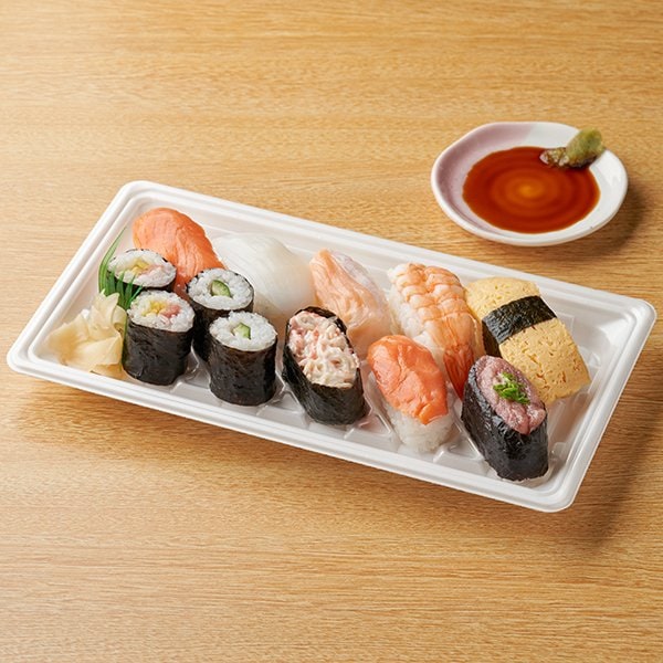 「人気のネタを使用したお寿司のセットです。銀鮭握り・やりいか握り・トロハラス握り・海老握り・玉子寿司・とろたく巻・かっぱ巻・カニカマ軍艦・ねぎとろ軍艦の9種類のお寿司を盛り合わせました。」