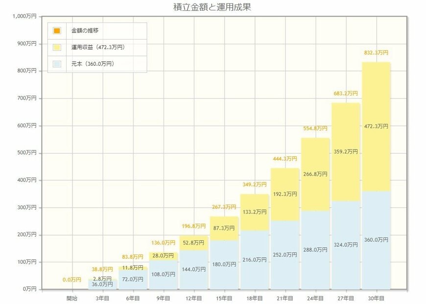 毎月1万円を30年間運用した場合、元本は360万円ですが、年率の違いで資産がいくら変わるのか、金融庁の資産形成シミュレーターで確認してみましょう。