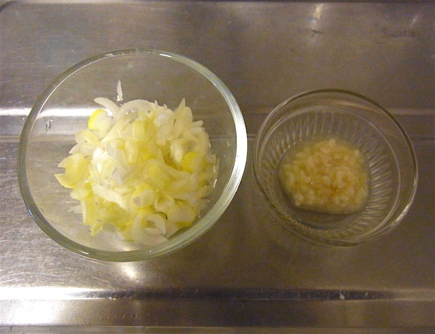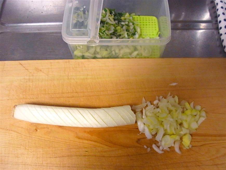 - はじから切っていく(これが「ええ感じのネギ」)。切ったものを塩麹と混ぜる。10分くらい置いてしんなりさせておく。