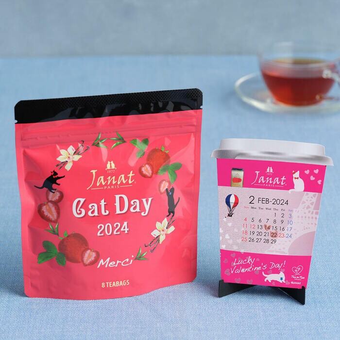 - セット内容:オリジナル ネコの日バッグ、オリジナル ニャッフル(2枚入)、オリジナル 紅茶のチョコレート(個包装6個入)、ジャンナッツ メルシー(ティーバッグ8個入)、ジャンナッツ カレンダー(1個)(※カレンダーは2024年2月~2025年2月までです)、オリジナル ネコプレート