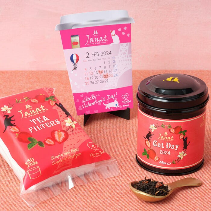 また、ネコの形をしたチョコレート味のカップケーキと、ラズベリーパウダーを練り込み甘酸っぱい味わいに仕上げたホワイトチョコレートに、ストロベリーの果肉と葉、バニラを使った甘い香りの「ジャンナッツ メルシー」、紅茶を淹れる時に便利なティーフィルターとジャンナッツ カレンダーがセットになったゴージャスなラインナップです。