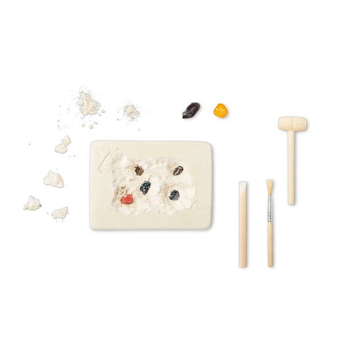 次に紹介するのは、宝石の発掘体験ができるアイテムです。石膏の中にカラフルな石が隠されており、付属のハンマーやスティックを使って発掘します。