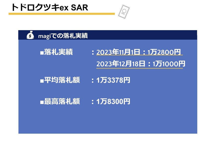 2024年1月までのカード単品の最高落札額は「トドロクツキex SAR 090/066:1万8300円」でした。