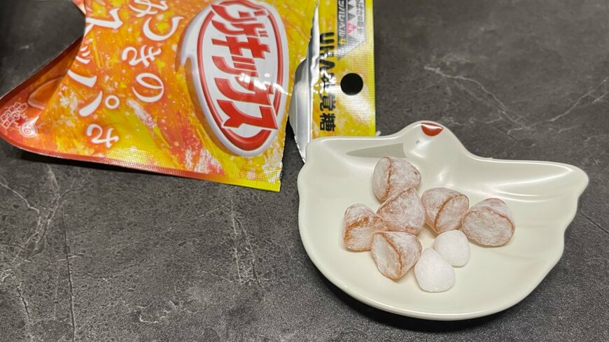写っているのは、名の知れたお菓子「シゲキックス」の袋ですが、手前の皿をよく見ると……?本来であればグミをまとっているはずの粉が、大きなかたまりと化しているのがわかります。