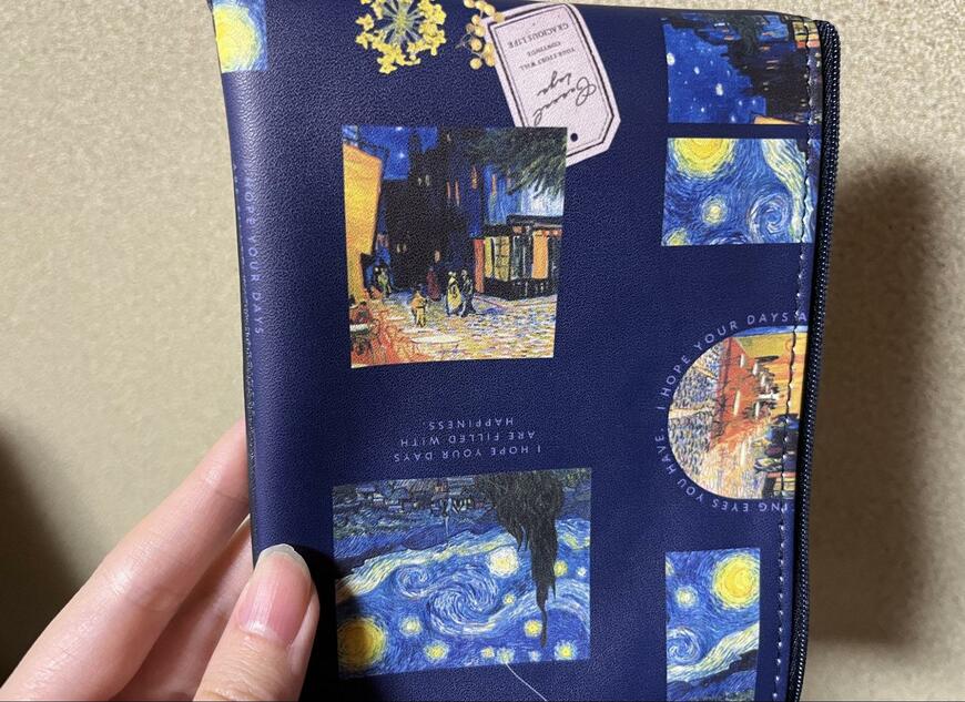 セリアの絵画デザインのポーチは2種類あります。こちらはゴッホデザインのポーチです。ブルーを基調としています。
