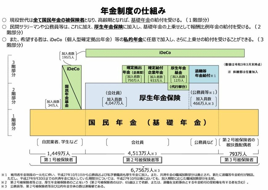 年金制度は、1階から3階の部分で構成されています。