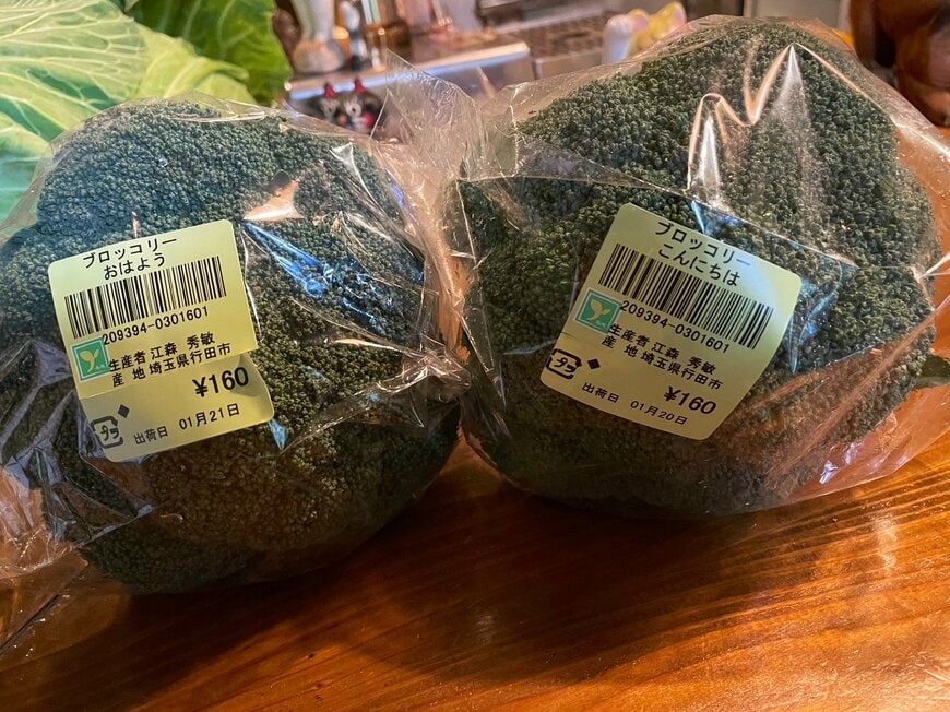 そこに写っているのは、それぞれのバーコードシールに「おはよう」「こんにちは」と記載されたブロッコリー。まるで本当にぺこりと挨拶しているようにも見えますね。
