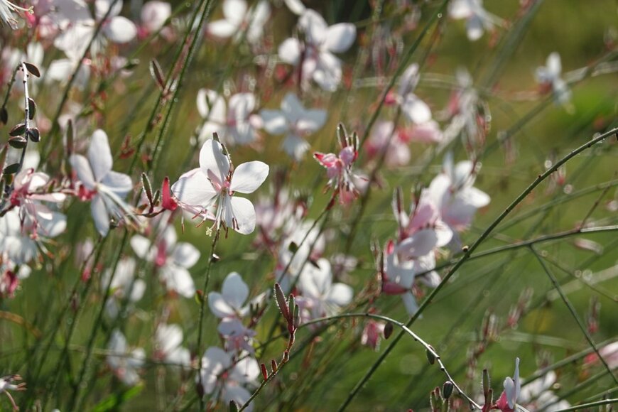 ヒラヒラと舞う、蝶のような形の花を咲かせるガウラ。美しい花姿が特徴の宿根草で、シェードガーデンでも生育可能です。