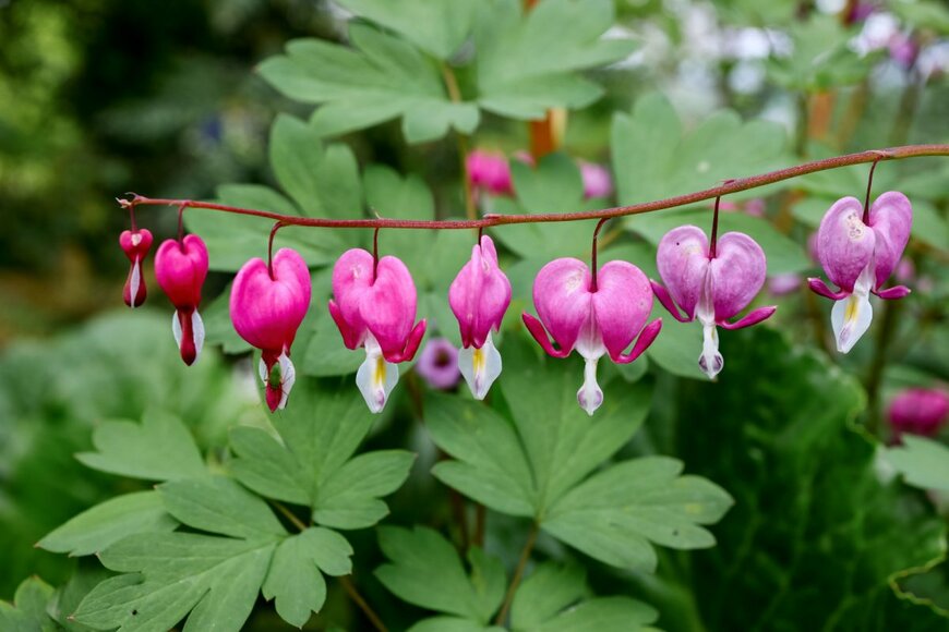 春から初夏にかけて、ハートから雫が垂れているような、キュートで個性的な形の花を咲かせるタイツリソウ。釣り竿に鯛が複数ぶら下がっているように見えることが、名前の由来です。
