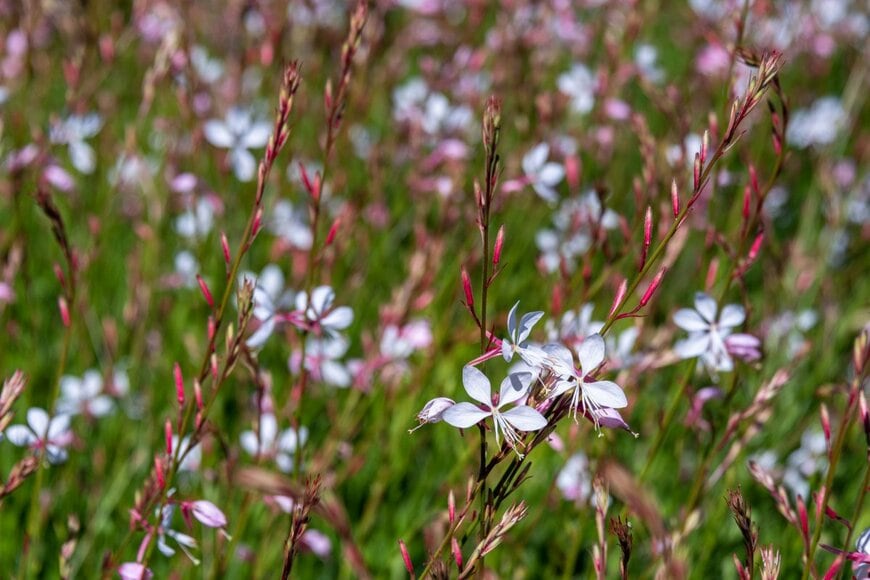 ガウラは初夏から秋の終わりころまで、長い期間花を楽しめる宿根草です。白い蝶のような可憐な花を咲かせることから、ハクチョウソウとも呼ばれます。