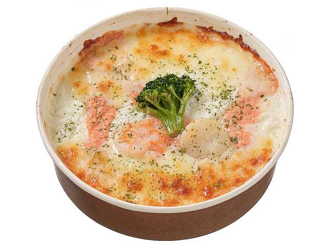 「ほたてから出た煮汁や魚介を加えた口どけ滑らかなホワイトソースに、北海道産のほたてとたらこソース、ブロッコリー、海老を盛り付けたドリアです。」