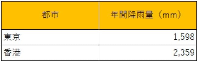 東京の2020年・年間降水量は、1598mmとなっています。一方、香港は2359mm(1992年〜2020年の平均値)。