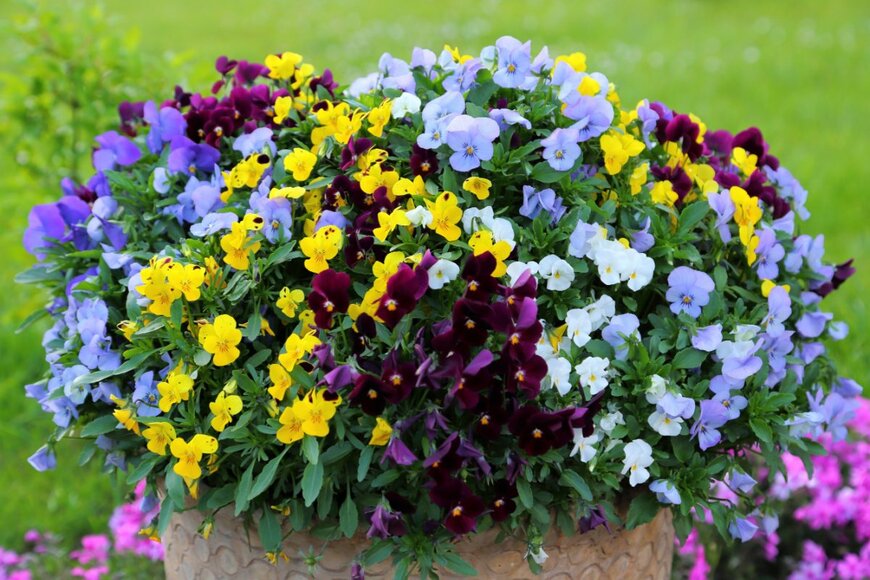パンジー・ビオラは春ガーデンに欠かせない一年草。ピンクやイエロー、淡いパープルなど、春らしい花色を選びやす異植物です。