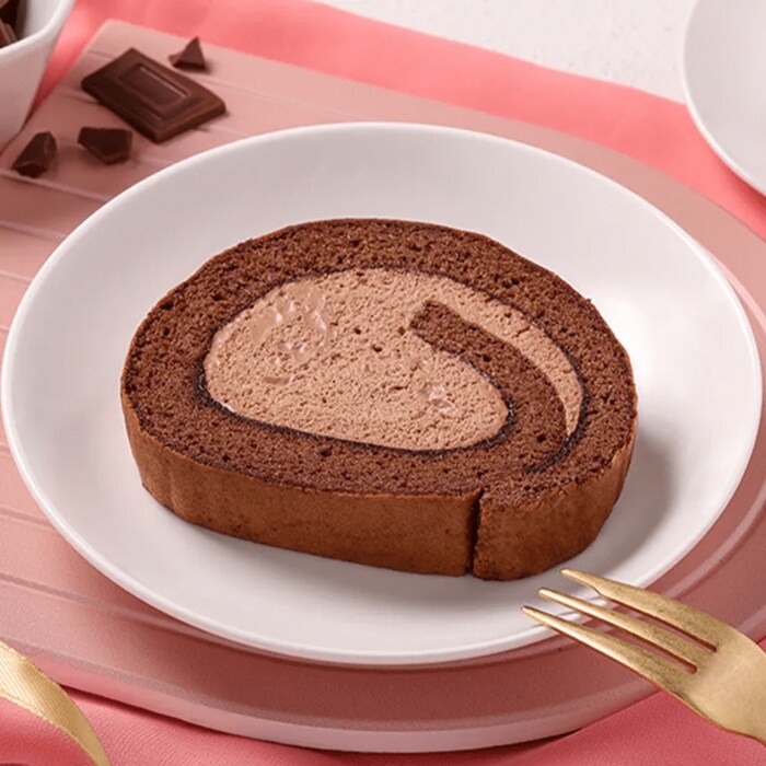 「チョコクリームソースをふわっと食感のココア風味ロール生地で巻き上げたロールケーキ。濃厚なチョコの味わいをお楽しみください。」
