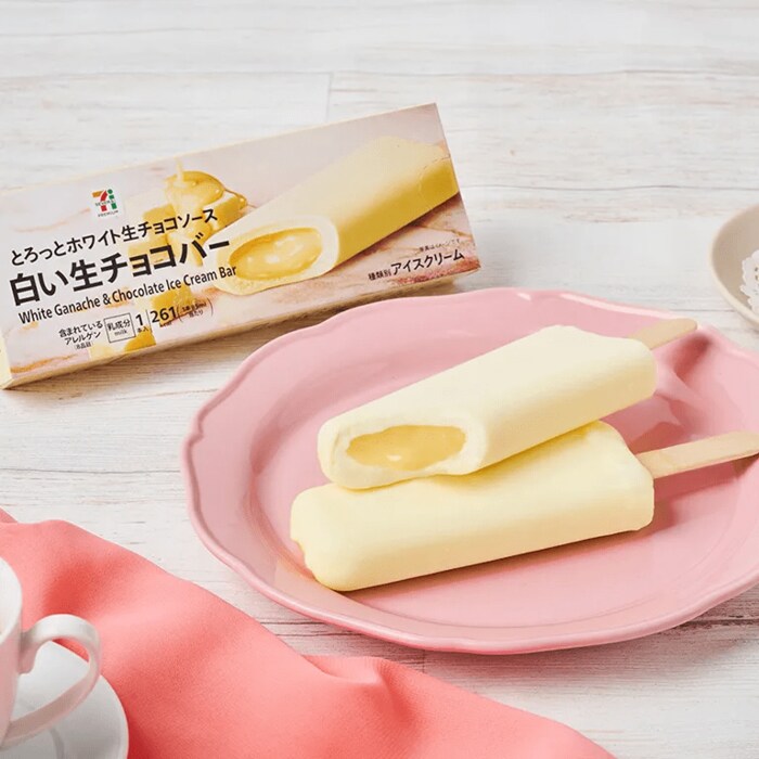 「ホワイト生チョコを使用したバーアイス。ホワイトチョコレートアイス、ホワイト生チョコソース、ホワイトチョコレートコーティングの3層が織り成す濃厚な味わいが楽しめます。」
