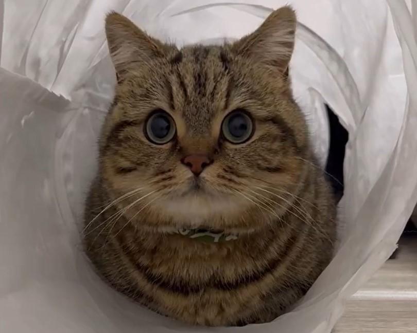 この日のチョパえもんくんは、白いトンネルの中で身体をまん丸にして座っていました。カメラ側では、飼い主さんがおもちゃを振って遊びに誘っているようですが……?