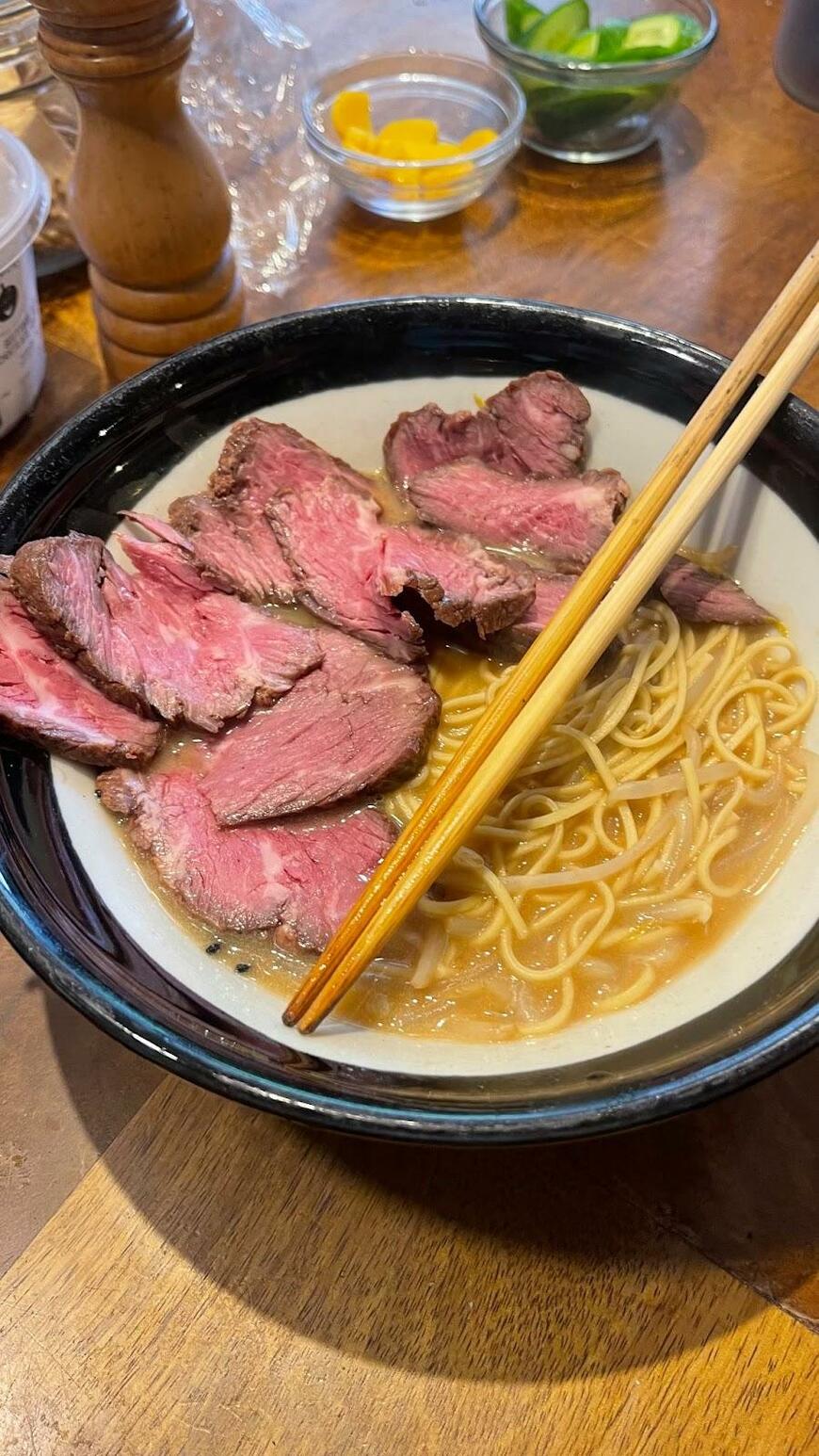 ラーメンの上に乗っているのは、なんと牛肩肉のステーキ。ステーキをチャーシュー代わりにたっぷりトッピングするとは、かなりわんぱくなアイデアですね。