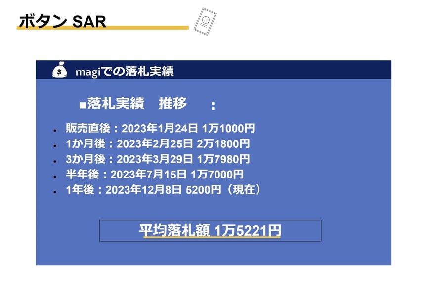 これまでの最高落札価格は「ボタンPSA10:3万2800円」でした。