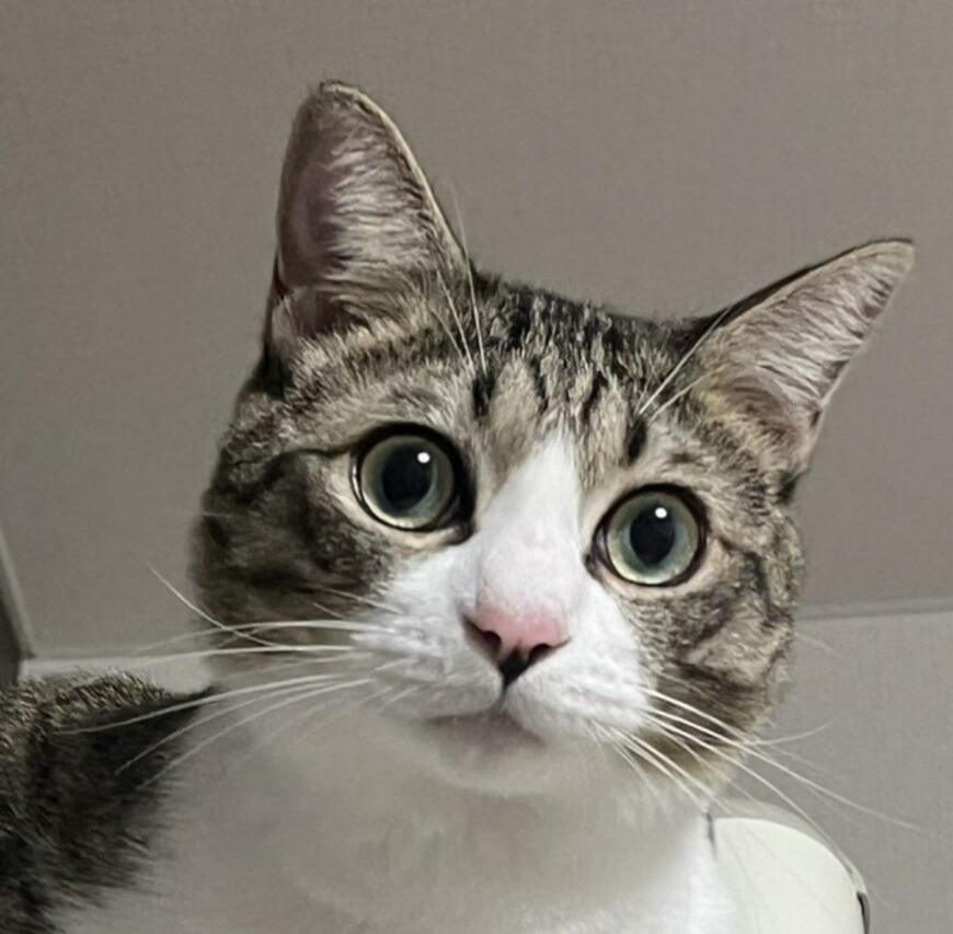 少々淡いキジ柄と、つややかな白い被毛が印象的。そして、きれいな「まん丸おめめ」が視線を惹きますね。