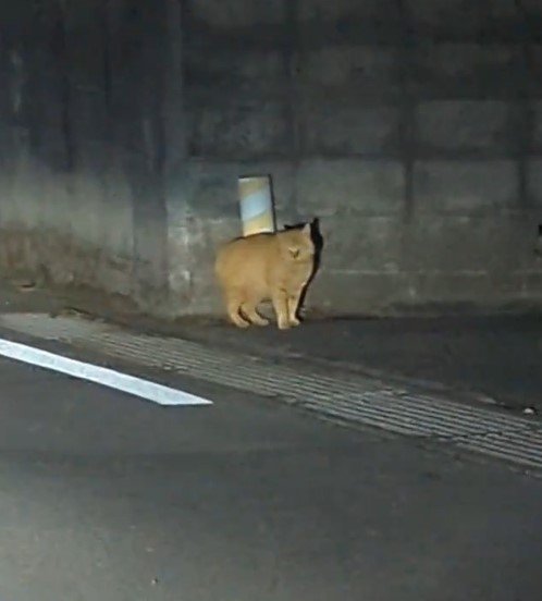 動画を撮影した時刻は22時頃で、車で帰宅している途中の出来事だったそう。当時の状況について「横断歩道上に動物の影があったので、危ないと思い止まったら猫でした」と教えてくれました。