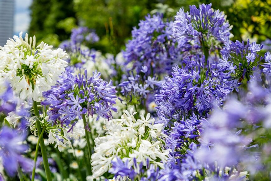 パープルやホワイトの花が咲くアガパンサスは、初夏から夏にかけて開花する宿根草。宿根草以外にも葉が枯れない常緑性の品種もあります。
