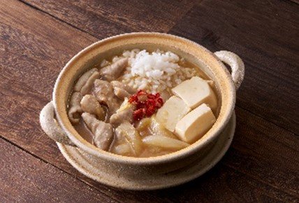 「『赤平がんがん鍋協議会』公認の赤平市の新名物 『がんがん鍋』です。豚骨の旨味と生姜等の香味野菜を加えた味噌ベースのピリ辛なつゆに、豚ホルモン、豆腐、玉ねぎを具材にした雑炊です。」