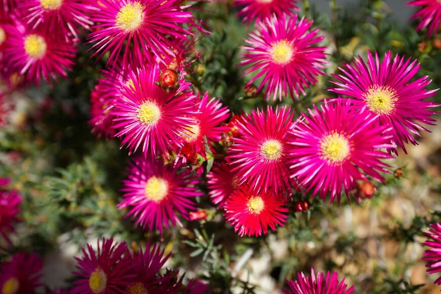 マツバギクはその名の通り、マツのような葉で、キクに似た花を咲かせる多年草です。初夏に咲く花の色や形は、品種によってさまざま。赤、黄色、オレンジ、ピンクなど、鮮やかな花色が多く、お庭のアクセントになりますよ。