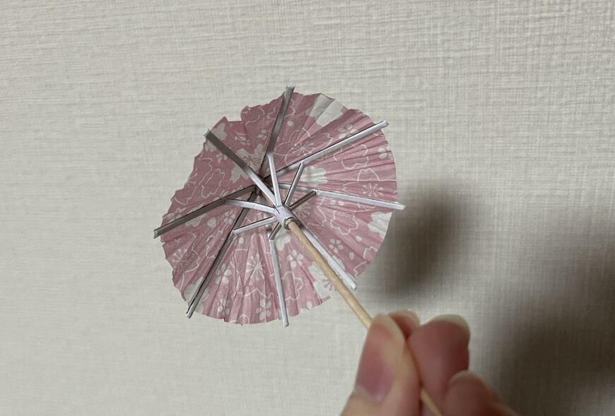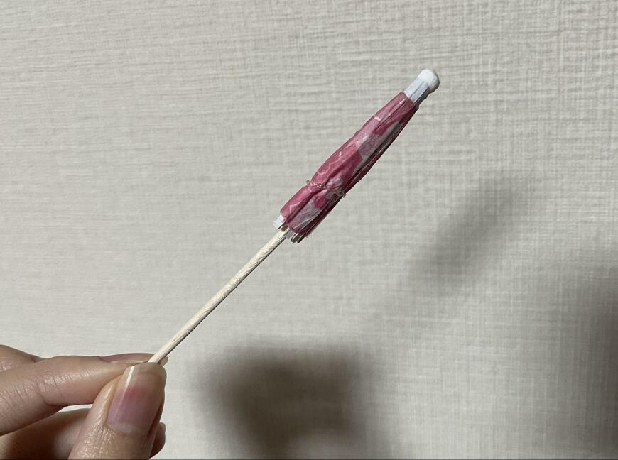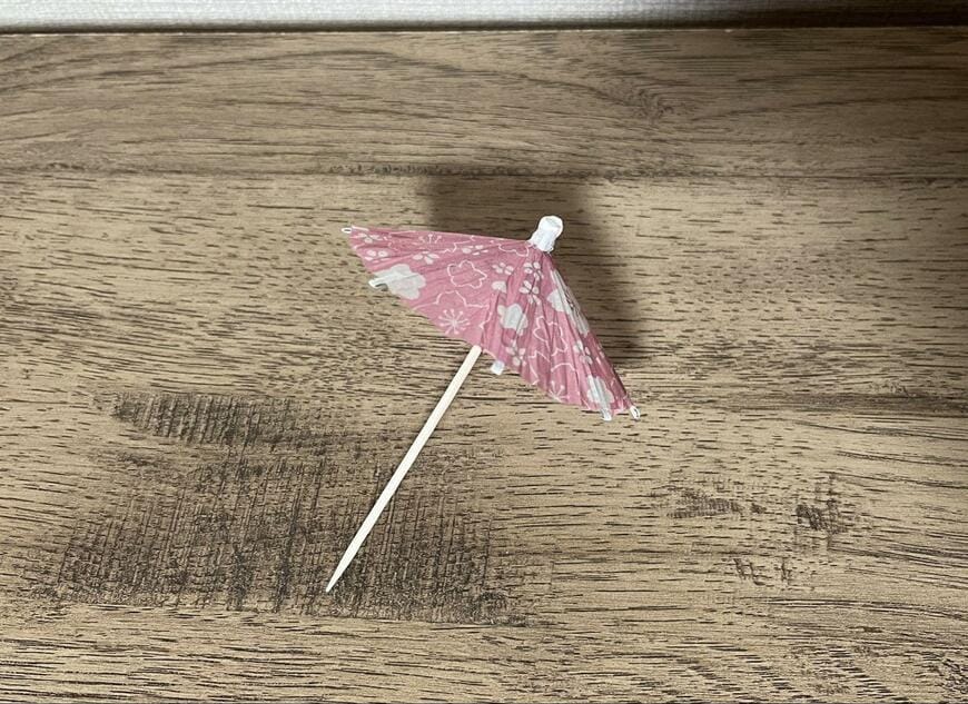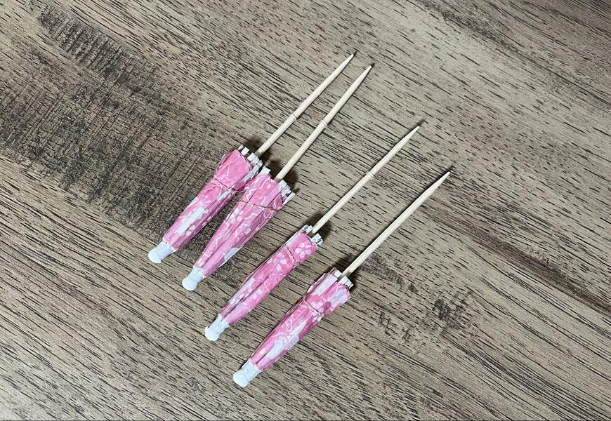 こちらがキャンドゥで販売されている、ミニチュア和傘「傘ピック4P桜」です。さくら模様がかわいいアイテムです。薄ピンクと濃ピンクの2種類展開です。