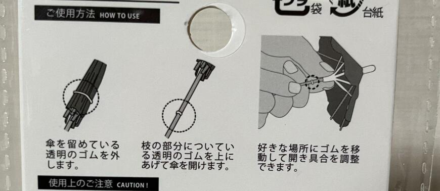 キャンドゥの「ミニチュア和傘」は、本物の傘のように閉じたり開いたりすることができます。柄の部分についている輪ゴムを使って、開き具合を調整することも可能です。