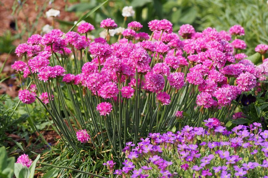 茎の先に可愛らしい丸い花を咲かせるアルメリア。ホワイトやパープルカラーもオシャレですが、おススメはピンクカラーです。大人可愛い雰囲気で、花壇や寄せ植えにも重宝します。