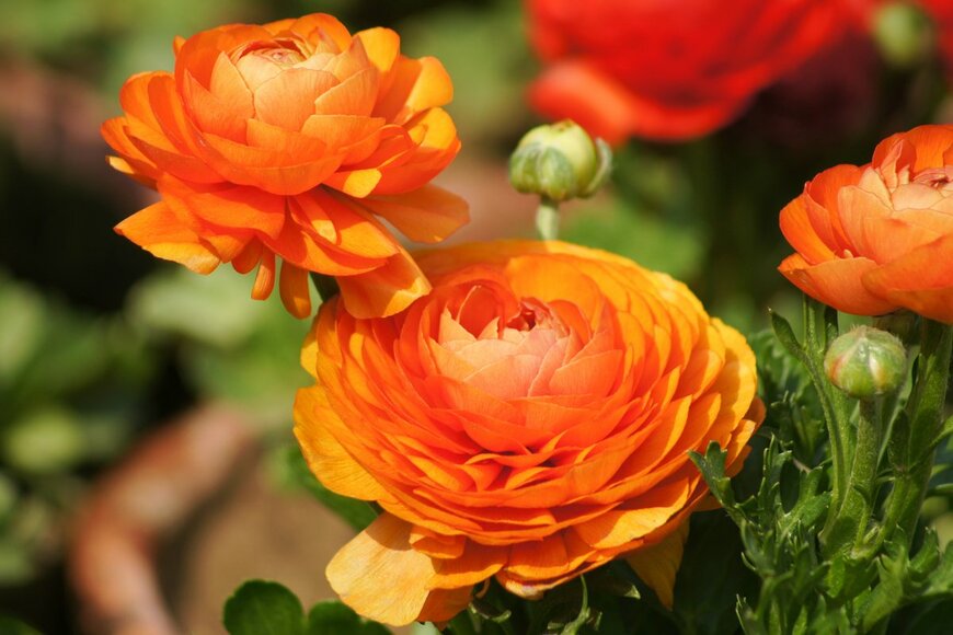 ラナンキュラスはゴージャスな花が魅力の球根植物。ヒラヒラした薄い花弁が重なり合い、優雅な花が庭を明るく華やかに演出します。