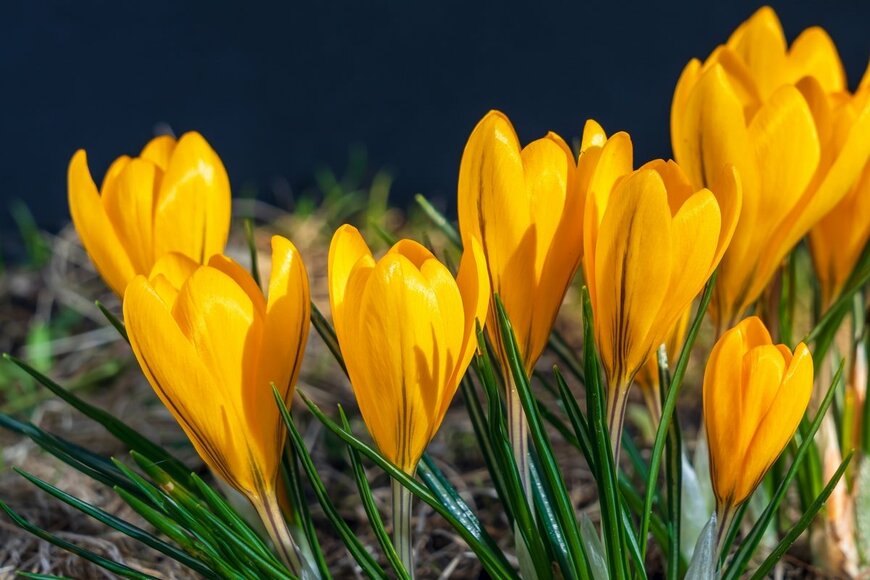 春咲き球根の中でもいち早く咲き始めるクロッカス。背丈が低い割には大きな花を咲かせ、黄色や白、紫などの色鮮やかな花が遠目からもよく目立ちます。