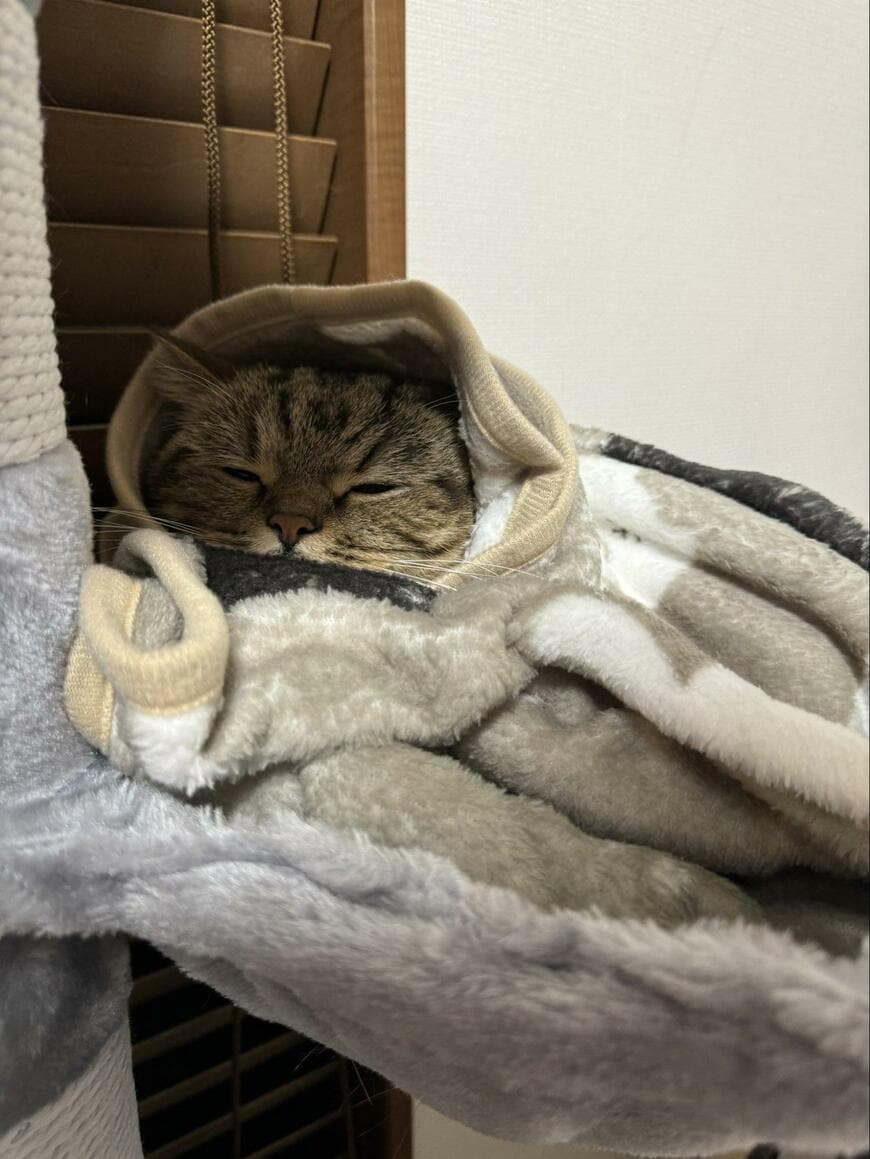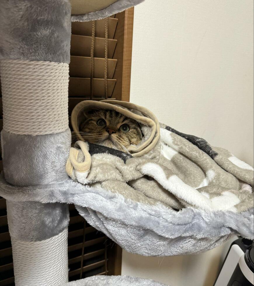 チョパえもんくんは、キャットタワーのベッド部分でくつろいでいる様子。この日はとっても寒かったようで、茶色のブランケットを身体にまとっています。まん丸のお顔をひょっこりと覗かせる姿がなんとも愛らしいですね。