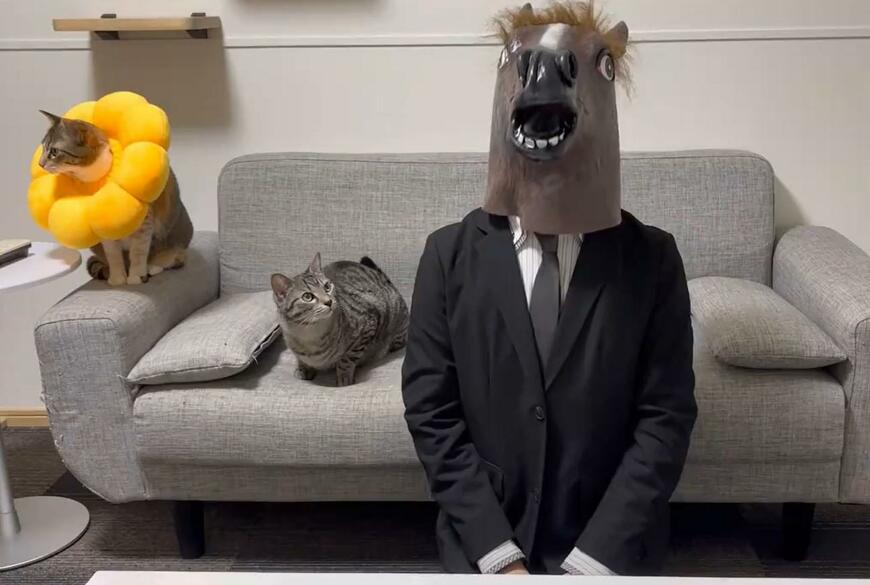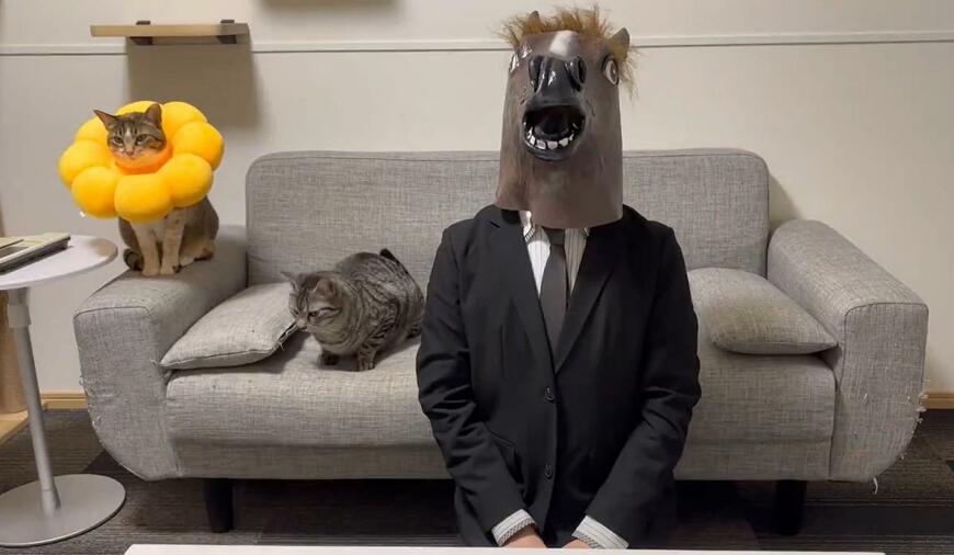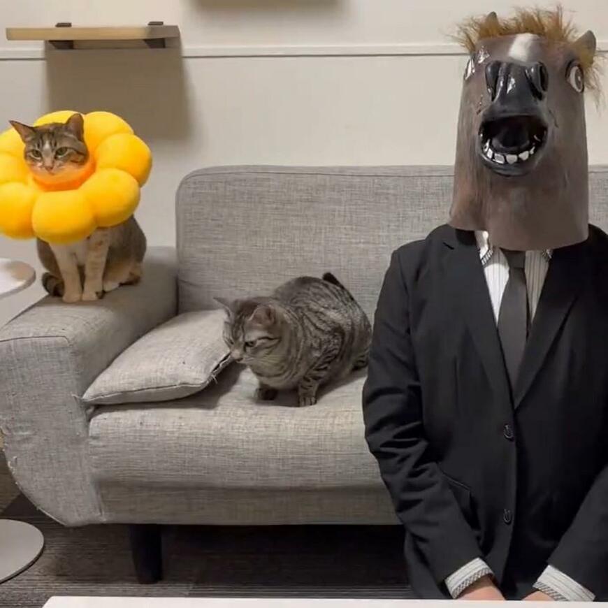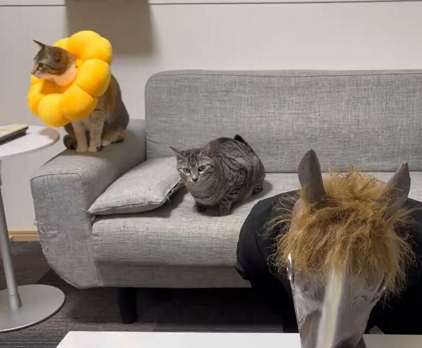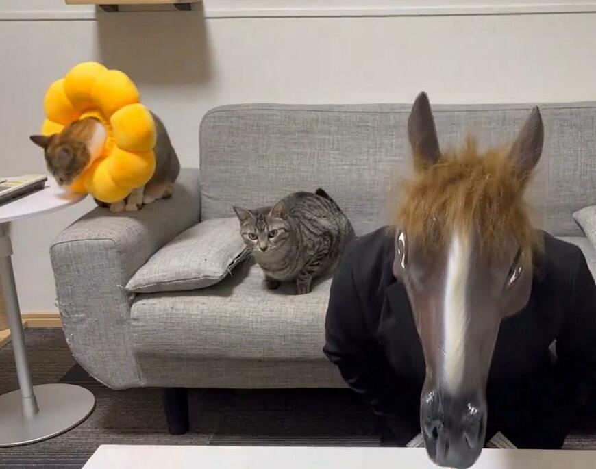 動画には、馬の被り物を身につけた投稿主さんが写っています。中央には「ととまる」くん、左側にはエリザベスカラーをつけた「はんみ」ちゃんも座っています。