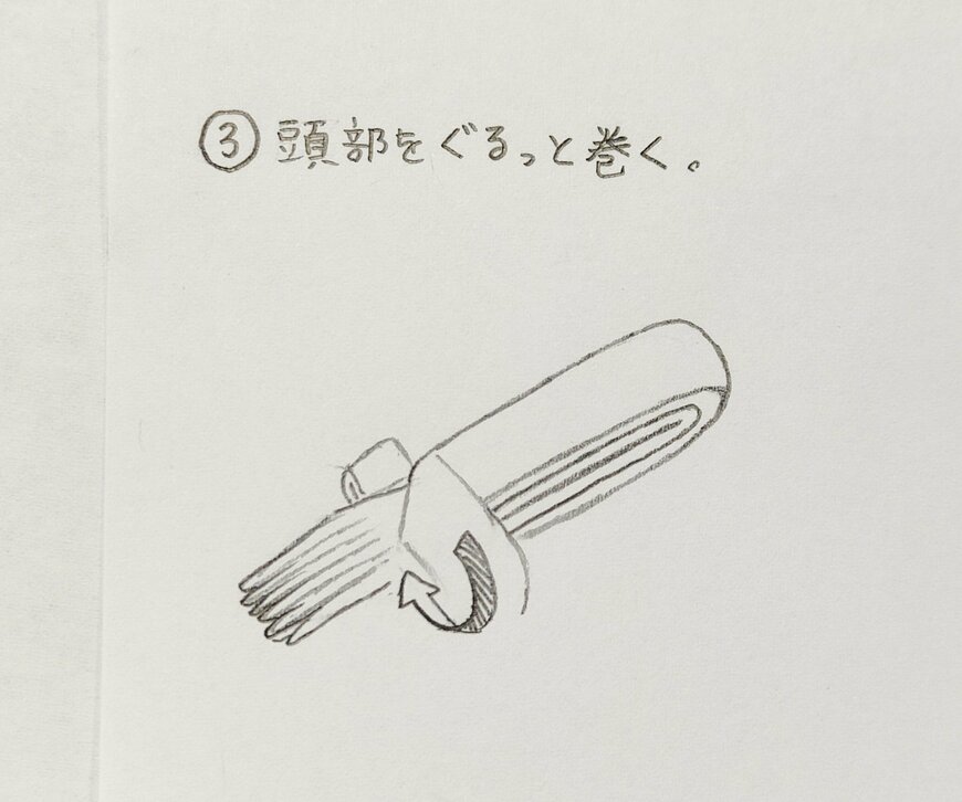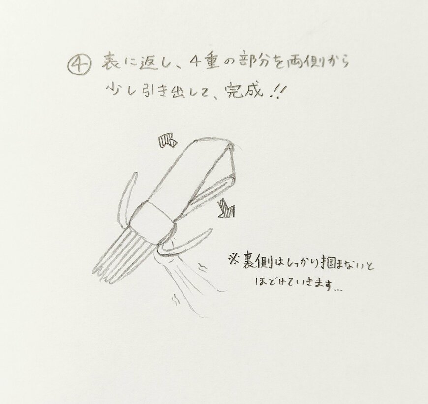 今回、ポスト後に25万いいねと大きな反響を呼んだイカマフラー。Xユーザーからの「作り方を知りたい!」という声に応えて、maruさんが鉛筆書きによるイラストで、作り方を分かりやすく紹介しています。