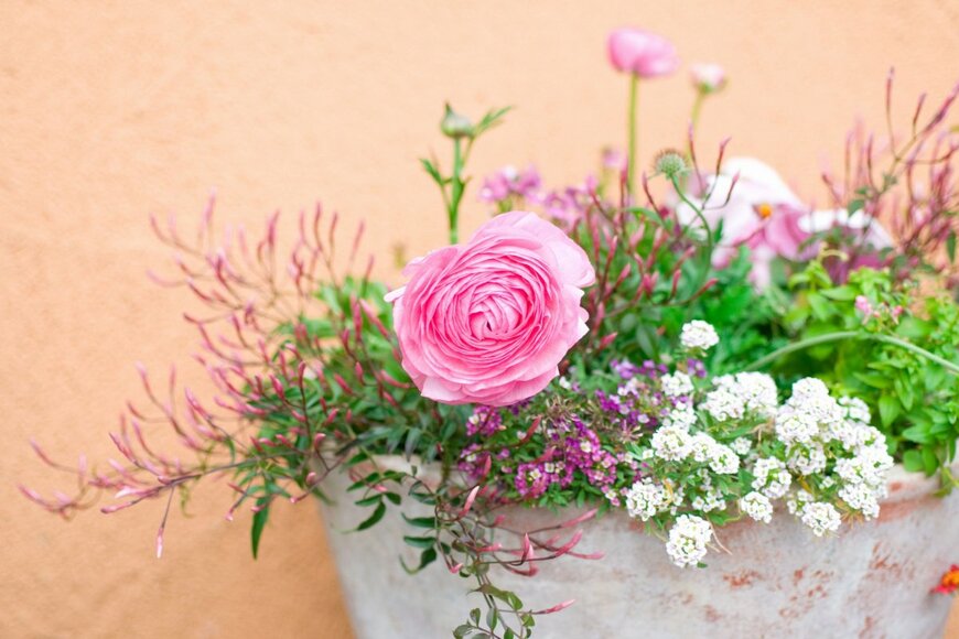 バラに似た、ゴージャスな花がひときわ目を引くラナンキュラスの別名はハナキンポウゲ。早春から春にかけて咲くキンポウゲ科の多年草です。オレンジや黄色、ピンクや赤のほか、グラデーションカラーなど、カラーバリエーションが豊富。