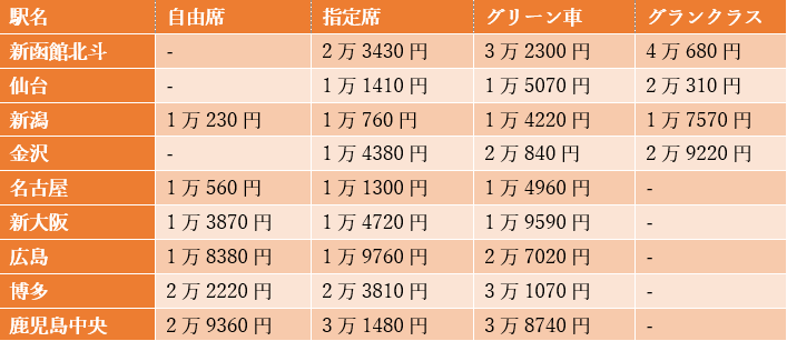 表に掲載している金額は、東北新幹線なら「はやぶさ」、東海道新幹線なら「のぞみ」など、各路線で最も早い車両の目安料金です。自由席が空欄になっているところもありますが、車両によっては利用できるものもあります。