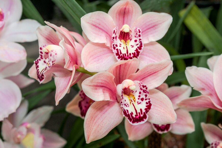 丈夫で比較的寒さに強く、初心者にも育てやすいシンビジウム。コチョウランと同様にギフトとしてもなじみ深い花です。優しい色合いの花からは甘い香りが漂います。