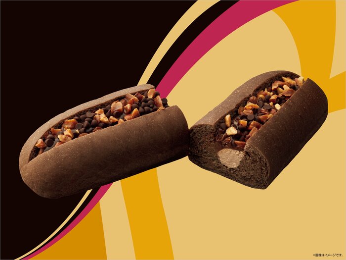 「ゴディバコラボレーション商品。しっとりチョコレート生地にチョコレートクリームとチョコレートホイップをサンドし、アーモンドとチョコレートチップで華やかに仕上げています。」