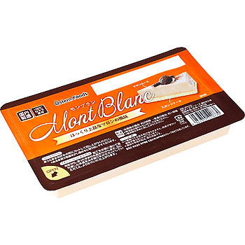 業務スーパー、オリジナル商品のモンブランケーキ。パッケージには、ケーキの断面写真とともに“ほっくり上品なマロンの風味”というフレーズが添えられています。