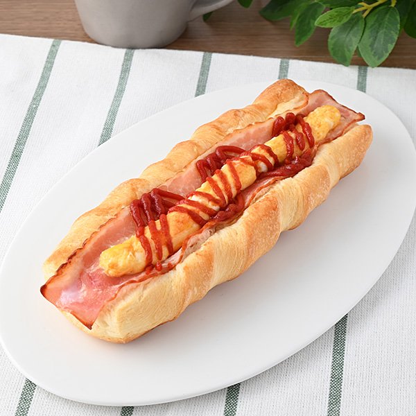 「ベーコン&エッグデニッシュはデニッシュ生地にベーコンとタマゴサラダ、ケチャップをのせて焼き上げた惣菜パンです。」