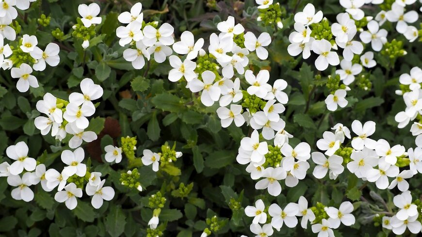 春に白やピンクのカワイイ小花を咲かせるアラビス。見た目の印象が異なる品種が数多くありますが、なかでも斑入りの葉がオシャレな「アラビス・プロカレンス・バリエガータ」は寄せ植えに人気の品種です。