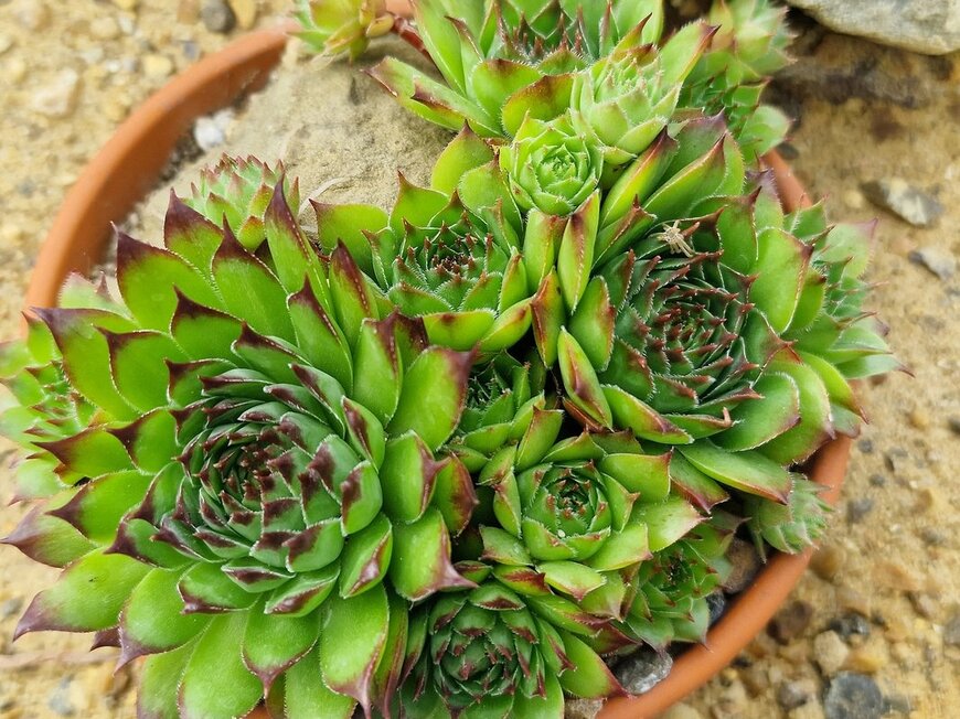 花苗と寄せ植えにするのも悪くありませんが、センペルビウム属を花に見立て、多肉植物だけの寄せ植えをつくるのもオススメ。
