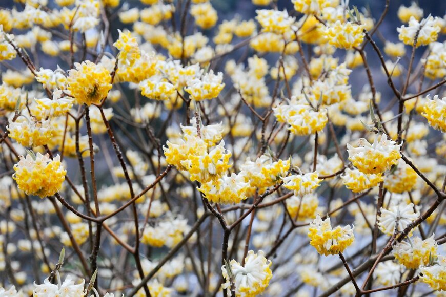 細い枝にうつむいて花を咲かせるミツマタ。枝が3つに分かれることが名前の由来で、花からは甘い芳香が漂います。日陰の森林でひときわ明るく輝くように咲く風景がキレイ。